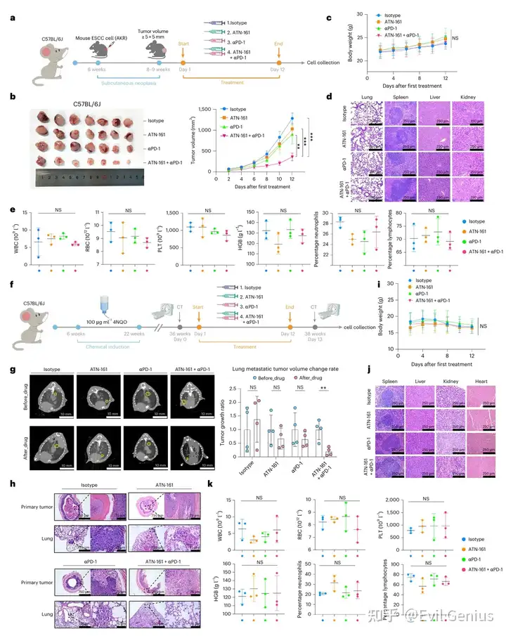 为模拟晚期转移性食管鳞癌,研究人员通过4-硝基喹啉-1-氧化物(4NQO)诱导构建了自发性肿瘤模型。当微CT检测到肺转移时开始治疗,结果显示:ATN-161与αPD-1联用不仅能有效抑制原发肿瘤进展,还可显著减少远处转移,且未观察到不良反应。