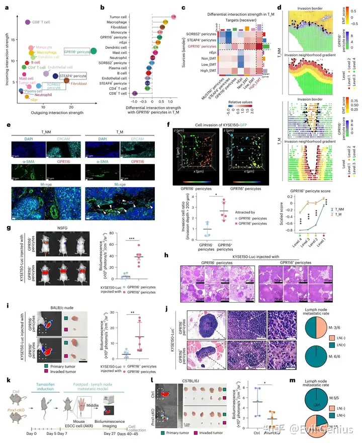 核心结论:PRRX1驱动产生的GPR116+周细胞,通过与高EMT潜能的肿瘤细胞密切互作并空间毗邻,在体外和体内均能强力促进食管鳞癌的侵袭和转移(包括血行肺转移和淋巴转移)。