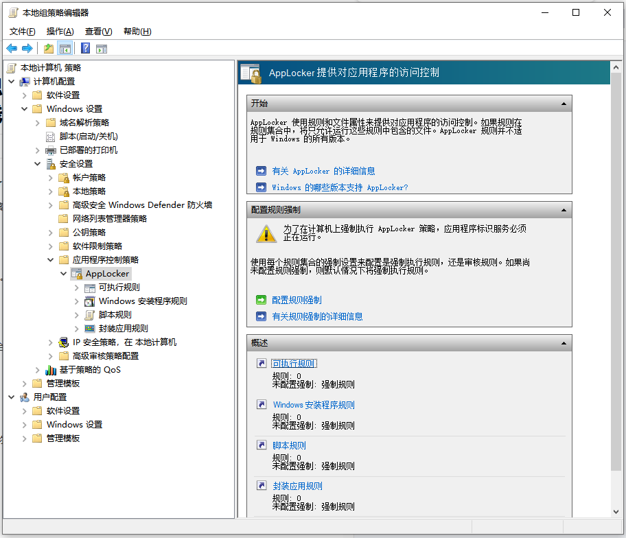 依次展开:计算机配置 → Windows 设置 → 安全设置 → 应用程序控制策略 → AppLocker。