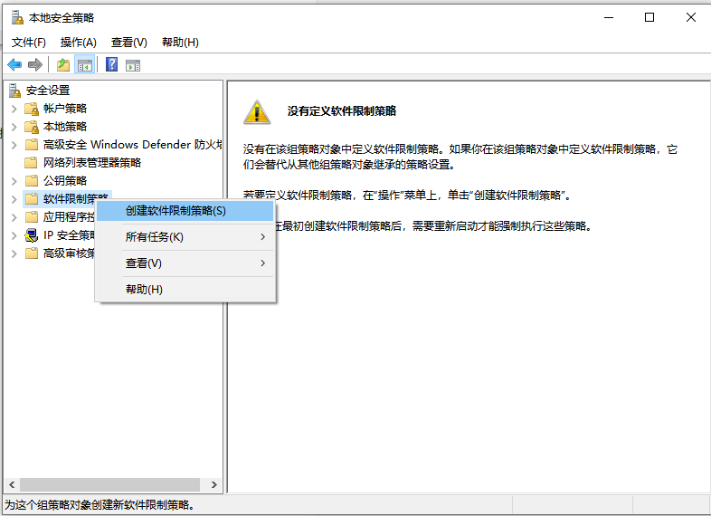 导航至"安全设置"→"软件限制策略",右键选择"创建软件限制策略"。