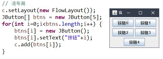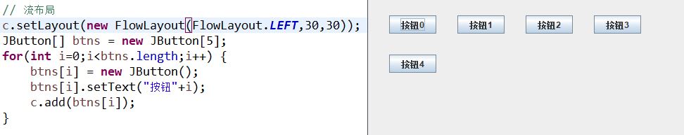 流布局有一个好处,它可以自动的为组件分配位置。 它还提供了对于对齐方式设置的方法。 在为容器设置setLayout方法时,参数可以是对象 new FlowLayout(对齐方式, 水平间距, 垂直间距) 流布局使用的是FlowLayout()类,在这个类中设定了三个对于流布局的设置。