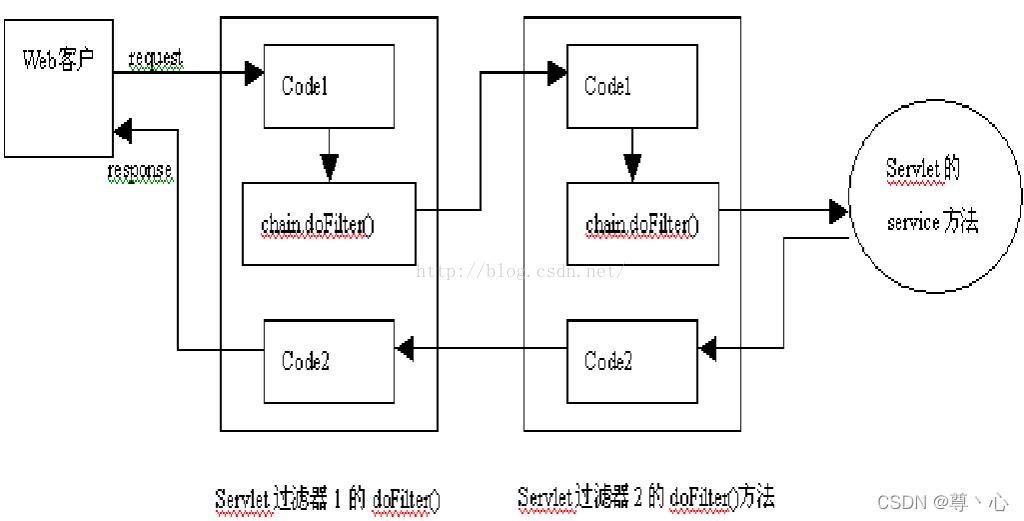 在客户向服务端发起请求时,Filter会横在Servlet、jsp、html跟客户的连接通道之间,从而达到过滤的效果。 在过滤器中的我们可以执行一段代码,这段代码是很有意义的,以此可以提高网站的安全性