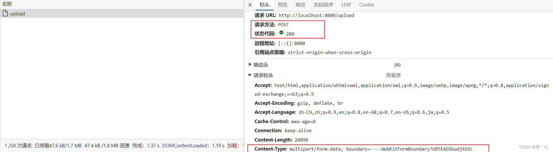 在发送带文件的请求时,请求头的信息应该是multipart/form-data。 出现这样的报错,多半是前端没有默认请求头。 而发掘请求的相关参数,也确实可以看到请求头是不符合文件上传要求的。