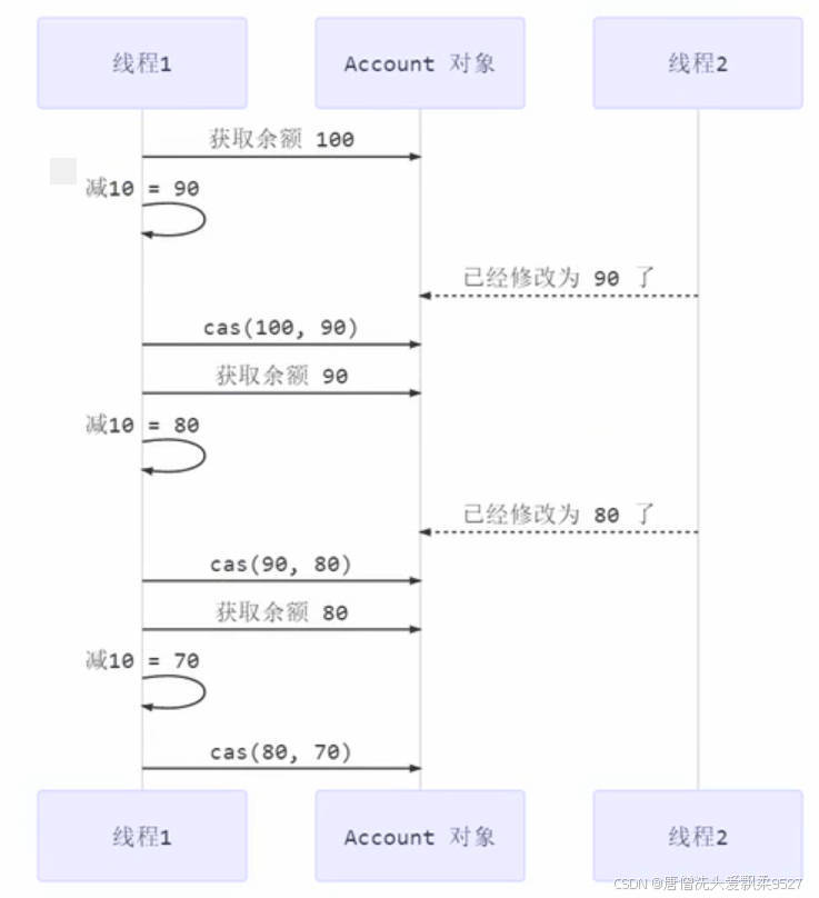 }其中的关键是compareAndSet,它的简称就是CAS(Coompare And Swap),它必须是 原子操作