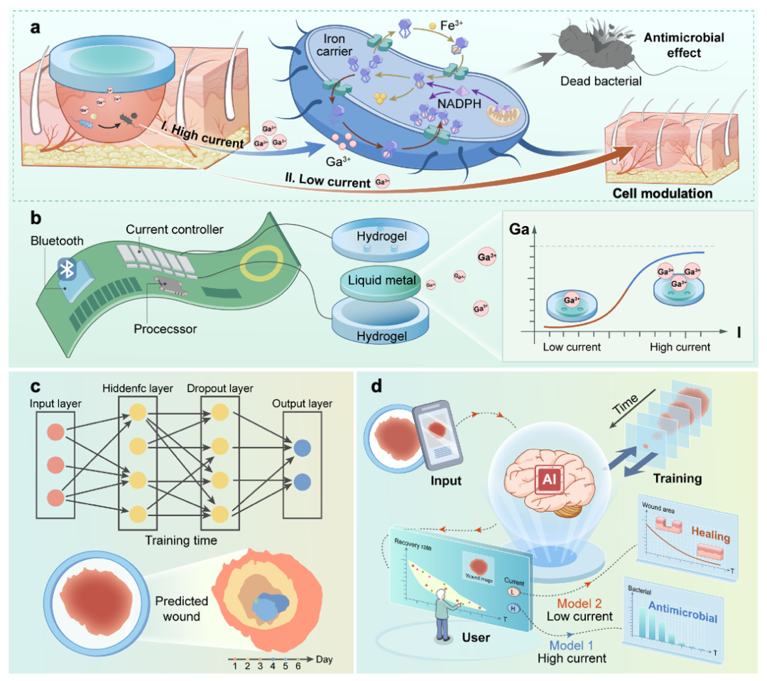 在本研究中,浙江大学贺永教授团队与浙大医学院附属口腔医院俞梦飞研究员团队提出了一种将再生生物电子与人工智能(AI)相融合的创新策略。在该体系中,AI 作为组织再生信号的反馈模块,兼具促进组织修复与智能响应的双重功能。在感染早期,生物电子装置通过高电流刺激触发液态金属释放高剂量镓离子,从而实现快速且高效的广谱抗菌作用;在愈合后期,AI 技术使装置能够根据创面状态自适应调控镓离子释放,显著加速组织再生与修复。该闭环治疗平台实现了对复杂创面的全程管理,不仅显著提升了现有创面护理的疗效,还开创了智能化愈合的新范式,标志着人工智能与再生生物电子及组织工程深度融合的重要突破(图1)。