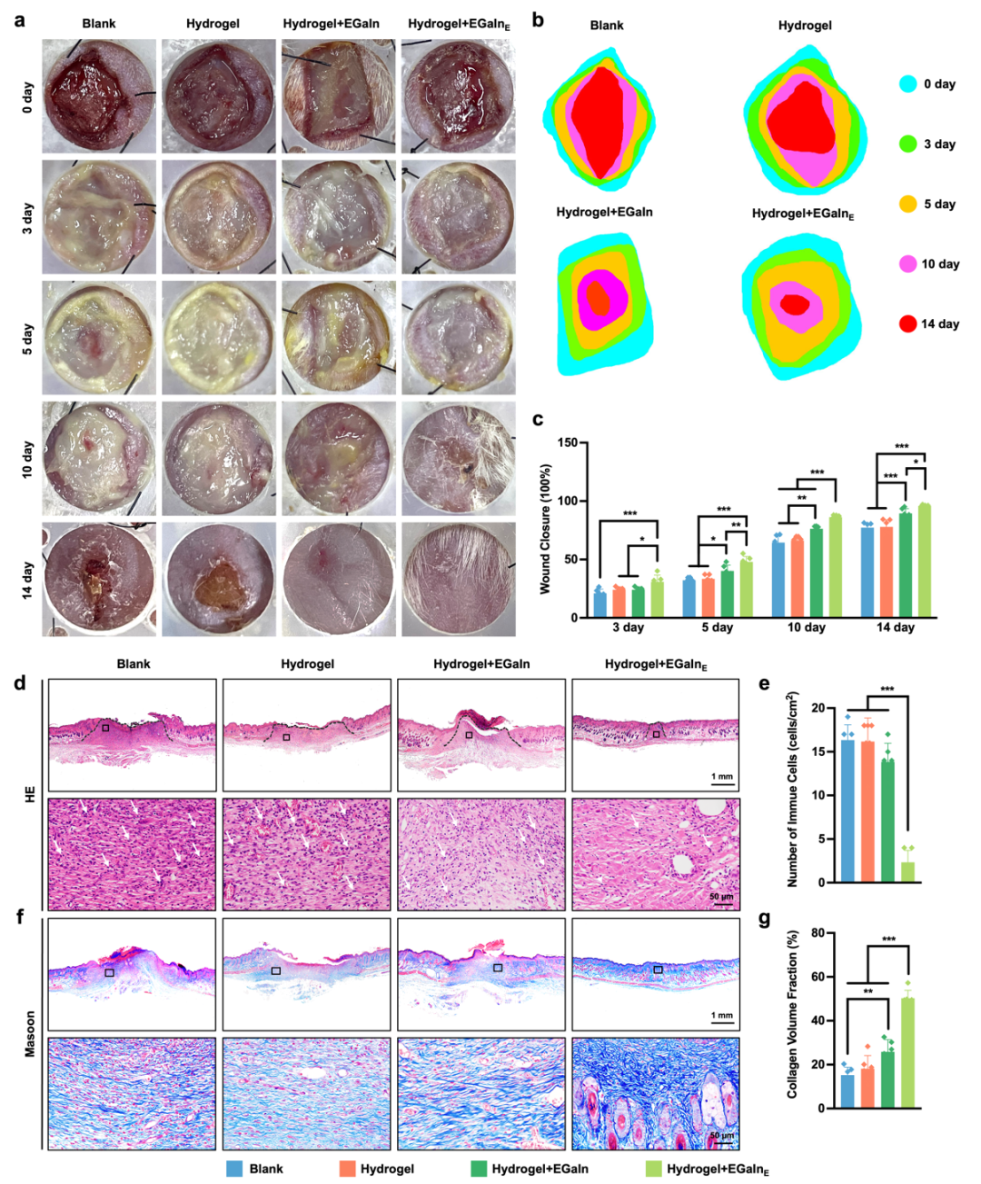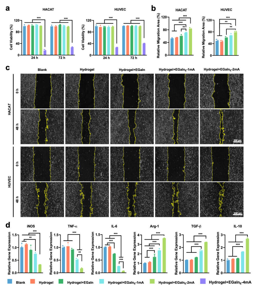 总体而言,通过对创伤愈合过程的14天跟踪结果可见,给予柔性贴片可控电刺激的治疗手段在促进伤口愈合方面显著优于其他对照组。这种治疗效果可归因于以下几个协同机制:(1)水凝胶可吸收多余的渗出液和血清,促进皮肤呼吸,有助于创伤修复;(2)在高电流刺激下,产生较高浓度的Ga³⁺。尽管高浓度Ga³⁺在体外会抑制正常细胞活性,但感染部位的细菌增殖速度远快于正常细胞,因而更快更大量地吸收并利用Ga³⁺。Ga³⁺被细菌误识为Fe³⁺从而被摄入,导致代谢错误并引发细菌死亡;(3)在低电流刺激下,产生较低浓度的Ga³⁺,此时能够促进细胞迁移、抑制炎症,最终加速创伤愈合进程。