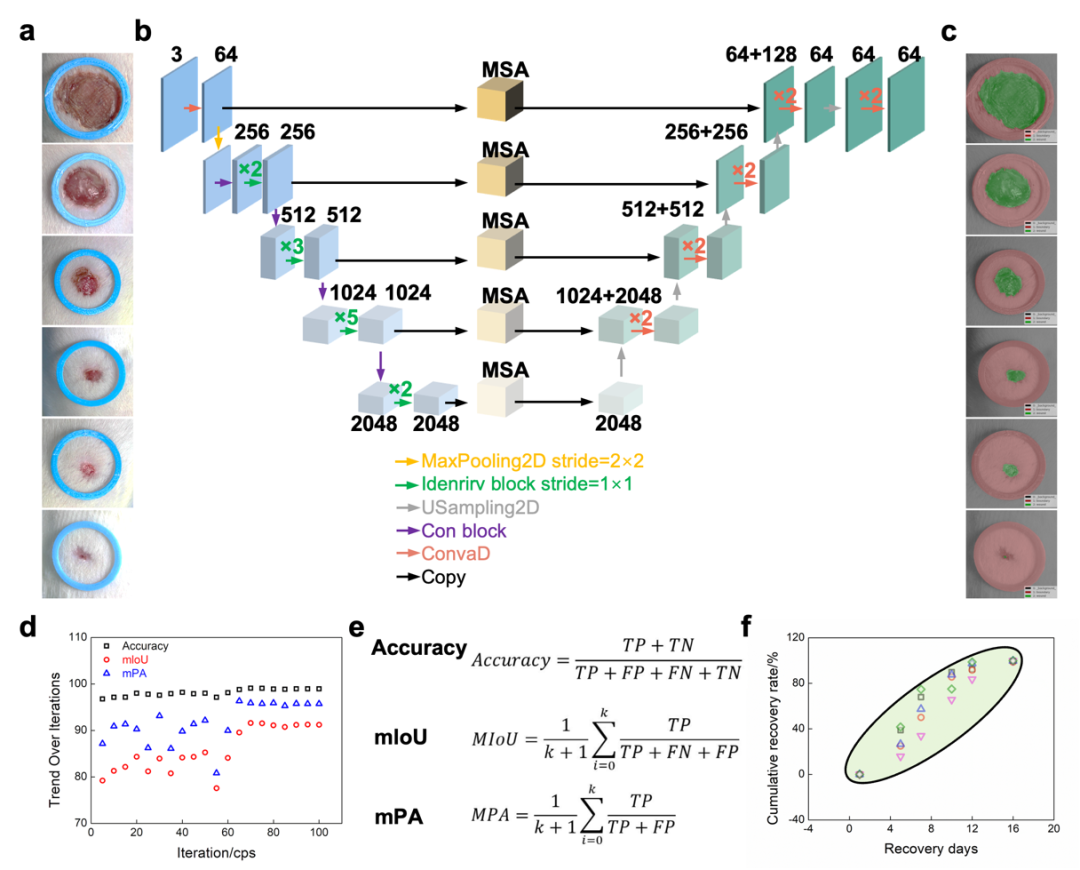 本研究展示了人工智能在伤口愈合监测与管理中的应用,整合了深度学习、多尺度注意力模块(MSA)及动态监测与干预功能(图7)。系统通过摄像设备获取高分辨伤口图像,卷积网络提取局部与全局特征,MSA模块关注关键区域并生成预测性的愈合特征图,直观展示面积变化和愈合分布。结合卷积与上采样操作,网络捕捉伤口长期和大尺度变化,为个性化治疗提供精准数据支持。通过追踪愈合曲线并建立标准化愈合模型,系统可识别异常愈合并触发干预策略,实现伤口愈合的实时监测与优化。训练过程中,模型性能指标稳步提升并趋于稳定,表明其具备良好的稳健性与泛化能力。