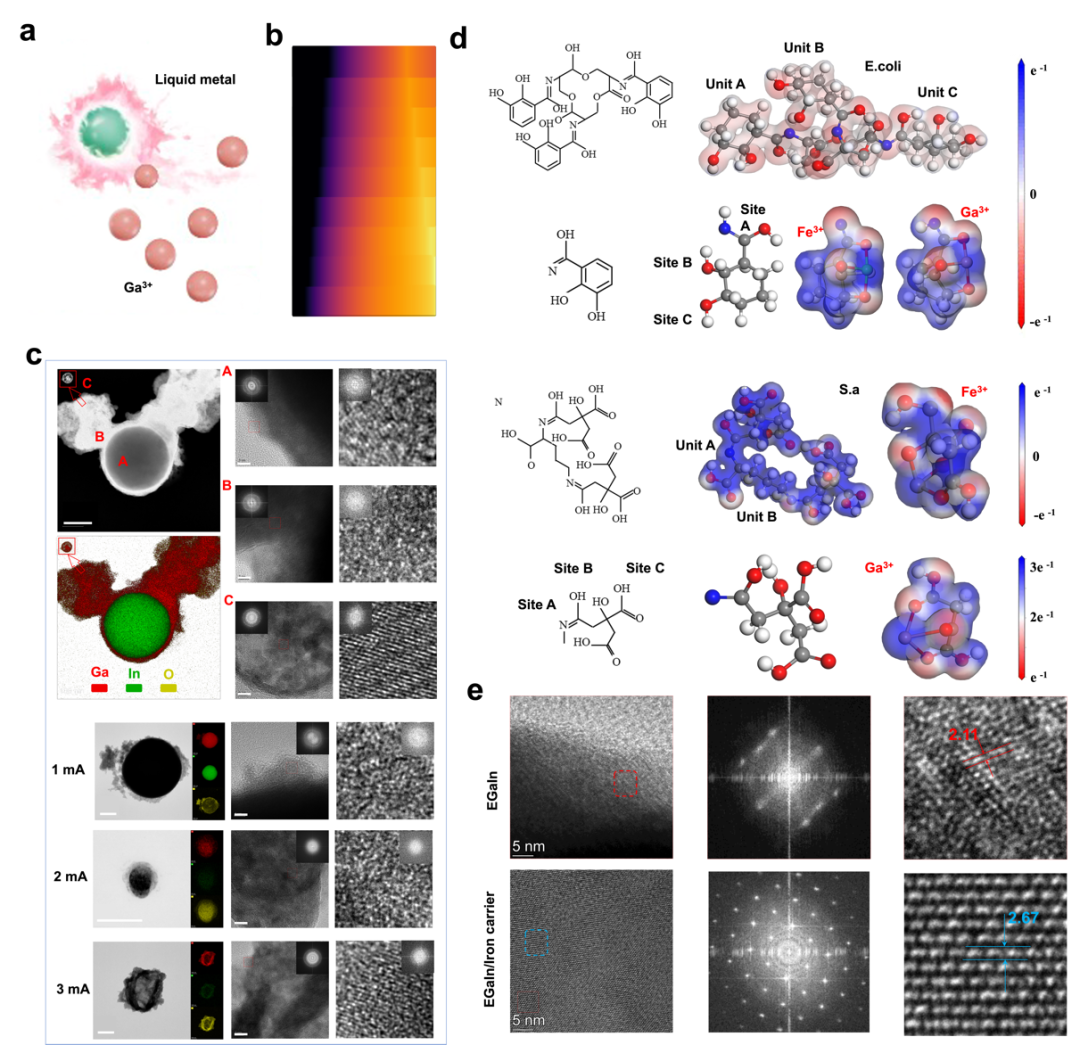 本团队在材料研究方面引入单宁酸(TA)优化复合水凝胶性能。结果表明,TA 的加入可降低孔隙率、增强力学强度与黏附性,并赋予材料优异的形状适应性。机理研究显示,TA 提升了水凝胶的黏弹性和分子间作用力,从而显著提高了其结构稳定性与应用潜力(图2)。体外实验表明,柔性生物电子贴片在 4 mA 电流刺激下可显著杀灭金黄色葡萄球菌和大肠杆菌,并抑制生物膜形成。低含量 TA 或低电流下无明显抗菌效果,SEM 与 Ga³⁺释放曲线一致,说明贴片在电流驱动下具有优异的抗菌性能(图3)。液态金属通过电刺激释放 Ga³⁺,在细菌体内与铁载体蛋白形成(-C-O)-Ga 配位结构,阻碍 NADPH 蛋白分解,使细菌无法获取必需的铁元素,最终导致细胞死亡。TEM 与 HRTEM 观察显示,Ga³⁺在细菌内形成掺杂颗粒,并与铁载体蛋白协同作用增强结晶性。量子力学计算进一步验证了(-C-O)-Ga 对 NADPH 蛋白的抗还原能力,揭示了液态金属的核心抗菌机制(图4)。柔性贴片在低电流刺激下对人角质形成细胞(HACAT)和人静脉内皮细胞(HUVEC)表现出良好的生物相容性,并显著促进细胞迁移,有利于伤口愈合。与此同时,低电流条件还能调控巨噬细胞炎症反应,抑制促炎基因表达并提升抗炎基因水平。通过阶段性调控电流强度,贴片兼具抗菌与组织修复功能,展现出广阔的临床应用潜力(图5)。在小鼠感染性创伤模型中,Hydrogel+EGaInE贴片显著加速创面愈合,14天闭合率达95.8%,高于其他对照组。组织学分析显示,该组创口免疫细胞浸润减少、胶原纤维密度增加,且CD31染色表明血管新生明显增强。与此同时,贴片有效调控炎症反应,降低促炎因子水平并提升抗炎因子表达,促进组织再生与创面修复(图6)。