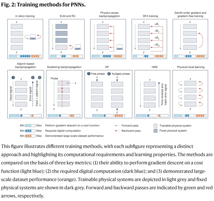 物理神经网络(PNNs)是一类利用模拟物理系统执行计算的神经网络。虽然目前仍主要局限于实验室的小规模展示,但PNNs有望在未来改变人工智能计算的方式。研究人员正在探索两大类训练方法:基于反向传播和无需反向传播的方法。尽管尚无方法能够在大规模模型中达到传统反向传播算法的性能,但多样化的训练技术正在迅速发展,并为PNNs如何实现高效、可扩展的人工智能提供了启示。