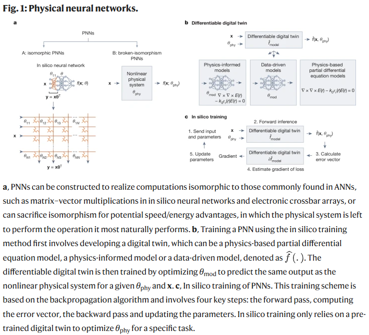 人工智能已在医疗、天气预测、材料设计等领域发挥重要作用,背后依赖于数字化GPU算力与庞大数据。然而,随着模型规模不断扩大,现有硬件的能耗、延迟和存储瓶颈日益突出。冯·诺依曼架构的内存—计算分离尤其成为限制。由此,基于光子学、模拟电子学等非传统计算平台的物理神经网络受到关注。PNNs利用物理系统的固有运算特性,可望突破数字硬件的能效限制,但其训练方式亟需重新思考,以适应物理硬件的约束。