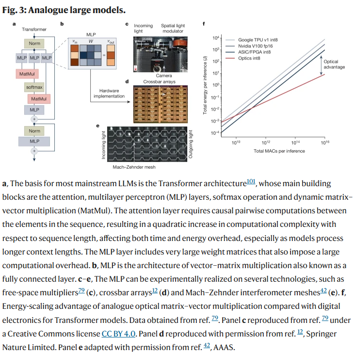 研究人员特别讨论了PNNs在超大模型中的潜力。例如在光学硬件中,运算能耗随规模增加呈1/N衰减,理论上可比数字电子更高效。对于未来10^15参数级别的模型,若硬件架构合理,PNNs或可展现出比GPU/TPU数千倍甚至百万倍的能效优势。这为大语言模型等超大规模AI系统的推理与训练带来希望。