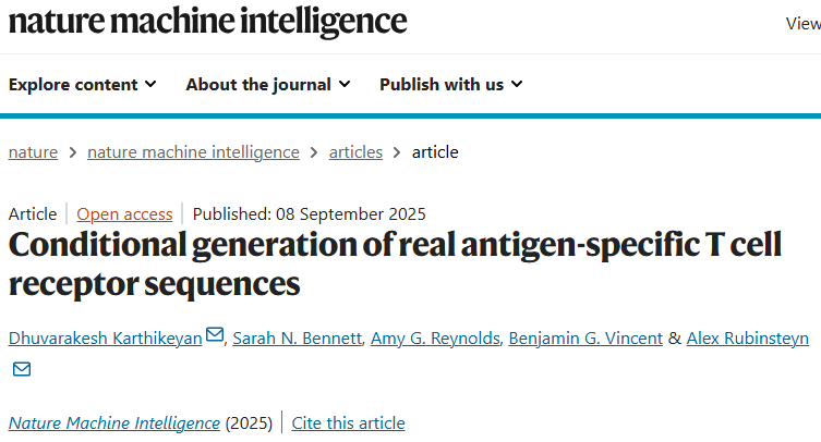 Karthikeyan, D., Bennett, S.N., Reynolds, A.G. et al. Conditional generation of real antigen-specific T cell receptor sequences. Nat Mach Intell (2025).