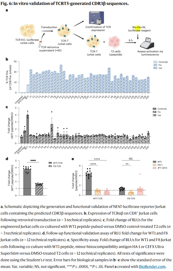 研究人员在白血病相关的 WT1 抗原 上进行了体外实验。40 条生成的 TCR 构建体中,有 1 条(F8 序列)成功触发了 T 细胞的功能性激活。虽然命中率不高(1/40),但仍远超传统发现方法的效率。此外,所有 40 个构建体都能在细胞表面正确表达,验证了 CDR3β 序列嫁接的可行性。值得注意的是,F8 对 WT1 产生反应的同时,也对广谱病原体肽池有反应,提示特异性仍需提升。