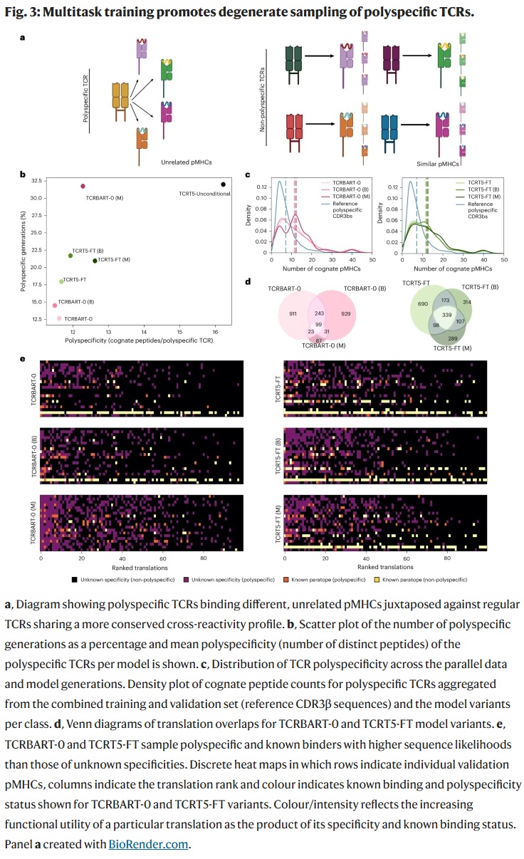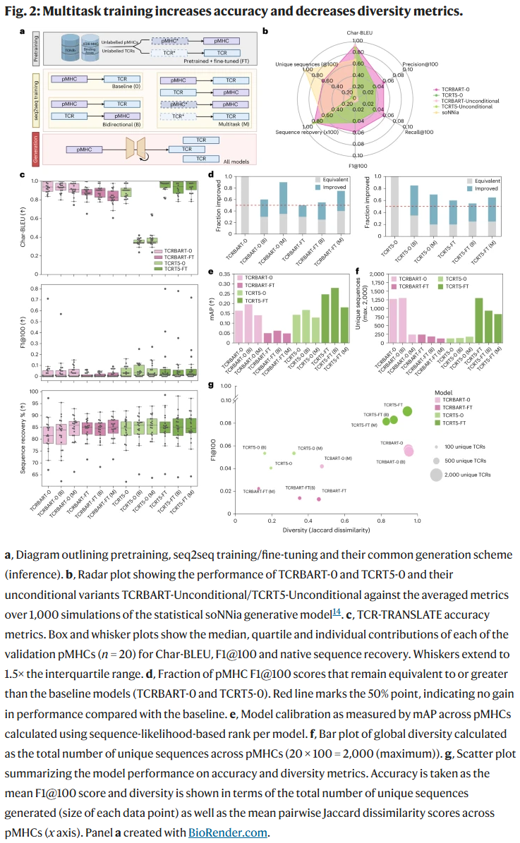 多任务训练提高了模型的准确性,但减少了生成序列的多样性。研究人员发现,这类模型倾向于生成 多特异性 TCR(能够识别多个不同表位),提示其可能通过牺牲多样性来换取更高的一致性。这种现象揭示了 准确性与多样性之间的权衡。