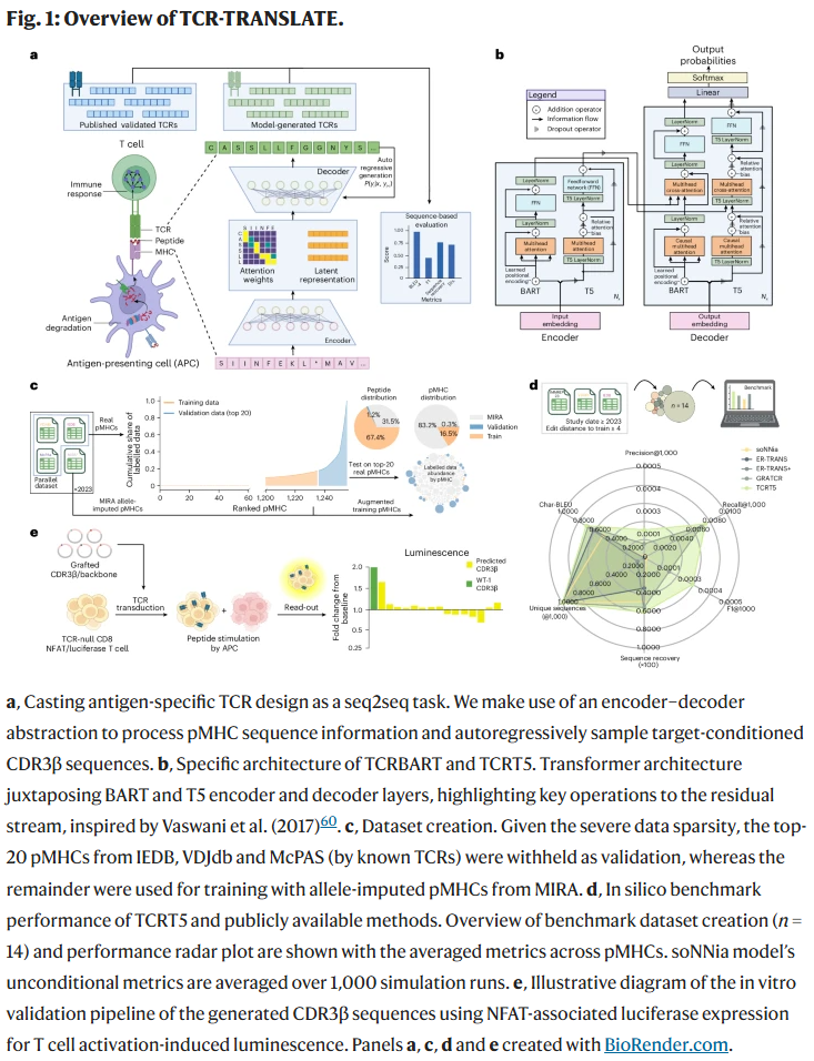 尽管近年来 T 细胞受体(TCR)工程取得了显著进展,但针对任意靶标设计功能性 TCR 依旧充满挑战,主要原因是交叉反应性的复杂规律和有限的配对数据。本研究提出了 TCR-TRANSLATE 框架,将低资源机器翻译的方法引入序列到序列建模,用于生成针对未见表位的抗原特异性 TCR 序列。研究人员系统评估了 12 种基于 BART 和 T5 架构的模型变体,揭示了性能与实用性之间的差异,并确定了关键影响因素。核心模型 TCRT5 在计算基准上优于现有方法,能够更高效地在前列位置优先排序功能相关序列。最重要的是,研究人员实验验证了一条针对 Wilms’ 肿瘤抗原的计算设计 TCR,该抗原是白血病的治疗相关靶点,并未包含在训练或验证集中。尽管该 TCR 展现出一定的病原体多肽交叉反应性,提示特异性仍有局限,但这一工作首次展示了仅凭目标序列即可在计算上设计出功能性 TCR 构建体。研究结果为计算驱动的 TCR 设计奠定了基础,并揭示了数据和方法学上的限制,为通过缩小靶标搜索空间来加速个性化免疫治疗提供了可行途径。