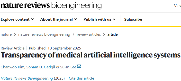 Kim, C., Gadgil, S.U. & Lee, SI. Transparency of medical artificial intelligence systems. Nat Rev Bioeng (2025).