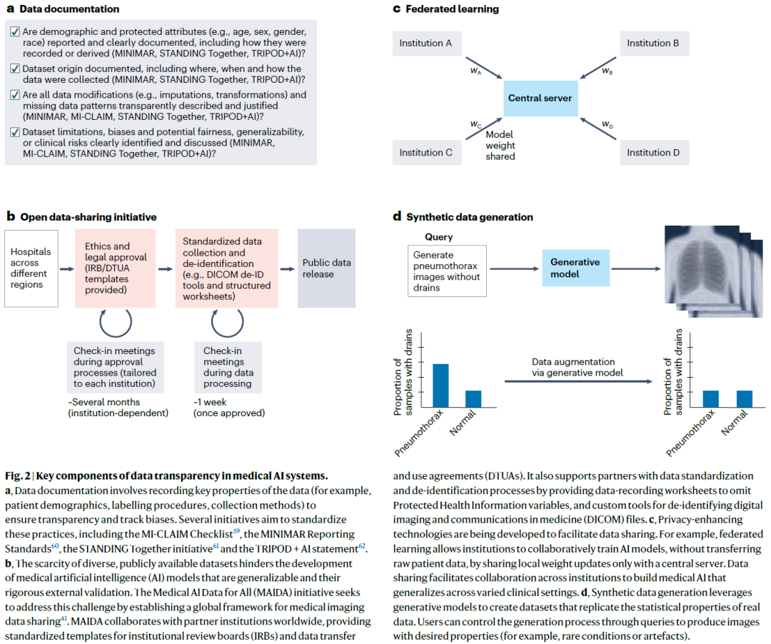 高质量、多样化的数据对于鲁棒模型的训练至关重要。然而,医疗数据因涉及隐私和法律限制,往往难以共享。大部分公开数据集样本有限,且缺乏多样性,难以代表真实世界。新兴方法如 联邦学习 和 隐私保护计算 提供了解决方案,使得不同机构能够在不交换原始数据的情况下协同训练模型,从而在保持隐私的同时促进透明性。