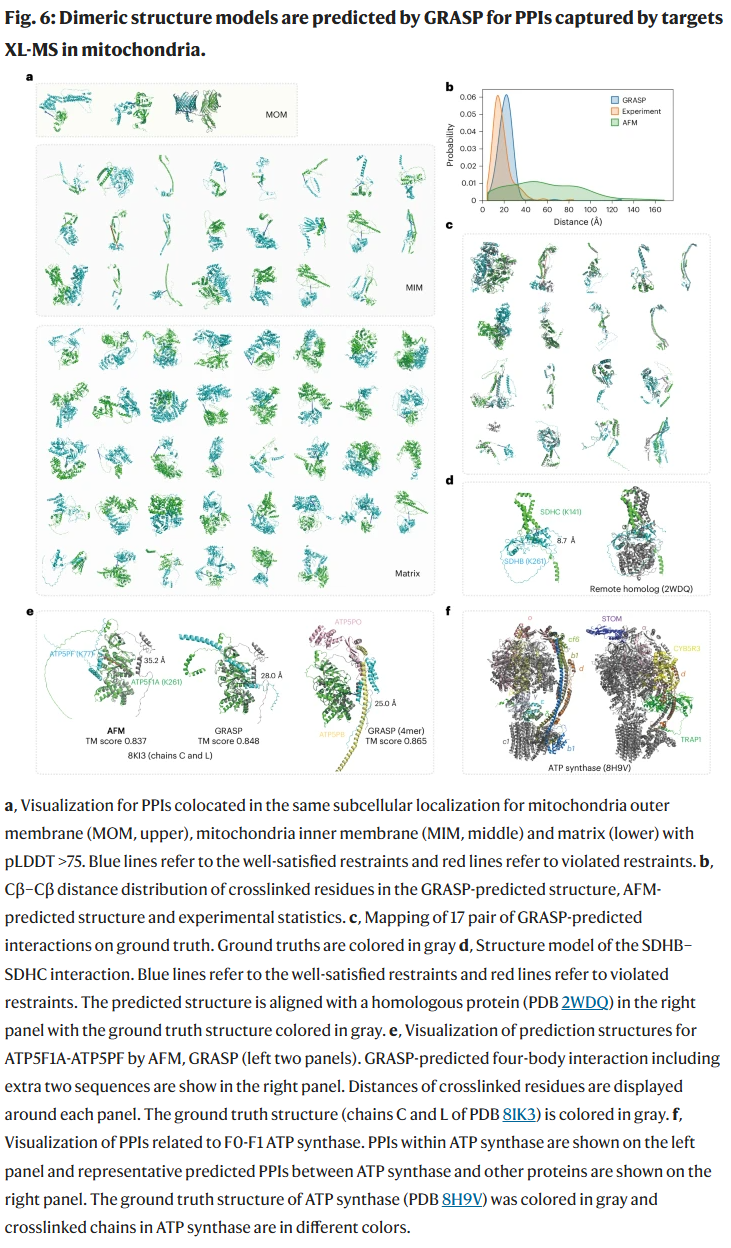 研究人员利用大规模线粒体交联质谱数据,将其转化为约束输入 GRASP,预测了 144 对蛋白质互作。结果显示,GRASP 的预测与实验数据分布高度一致,并能在多个已知真实结构中得到验证。部分互作如 ATP 合酶的亚基互作,预测结果与同源结构高度吻合。