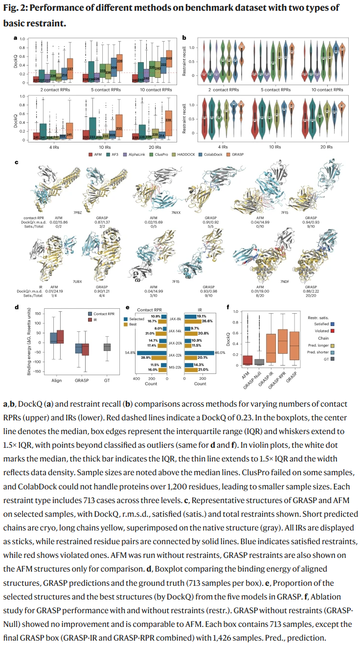 在包含 713 个界面的基准数据集上,GRASP 在不同数量的 RPR 与 IR 条件下均表现最佳。例如,仅需两个跨链接触约束,GRASP 就能将 DockQ 提升至 0.35,并使一半以上样本达到可接受水平。相比之下,AlphaLink、ClusPro、HADDOCK 和 ColabDock 整体表现不及 GRASP。