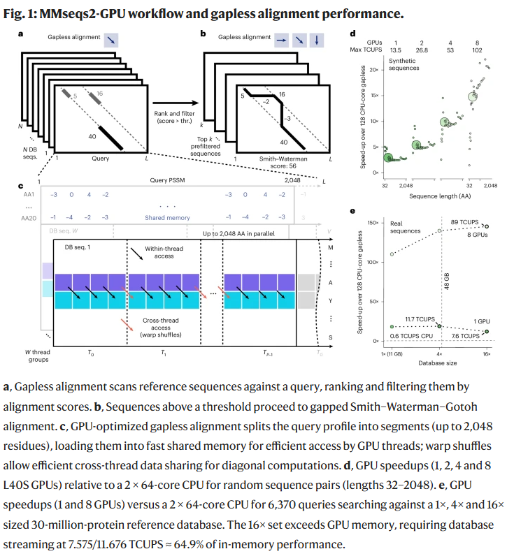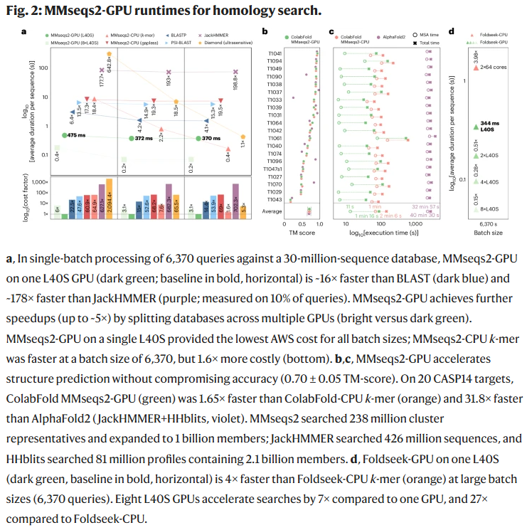MMseqs2-GPU 展示了 GPU 加速在蛋白质同源性搜索中的巨大潜力: