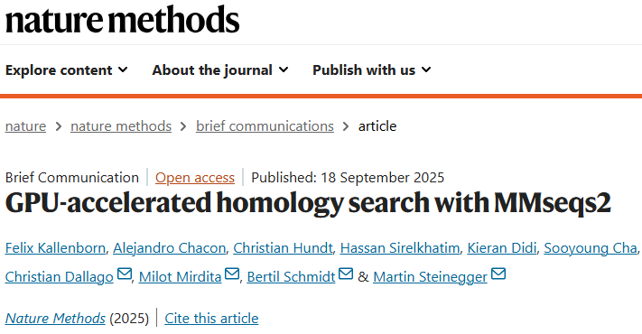 Kallenborn, F., Chacon, A., Hundt, C. et al. GPU-accelerated homology search with MMseqs2. Nat Methods (2025).