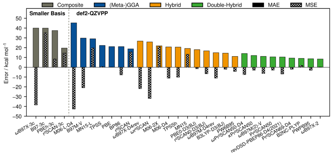 各类密度泛函近似(DFA)的平均符号误差(MSE)和平均绝对误差(MAE)如图7所示。由于伦敦色散效应预计对本文研究的小规模分解反应影响甚微,因此主要考察了不同DFA与色散校正的最佳组合。统计趋势与Perdew等人提出的Jacob’s ladder框架高度一致,即精度通常会随着阶梯的上升而提高。与此一致,双杂化泛函展现了最高的精度。在所有测试方法中,M06-L-D4的准确度最低(MAE=45.3 kcal·mol⁻¹),而ωB97X-2的准确度最高(MAE=8.4 kcal·mol⁻¹)。