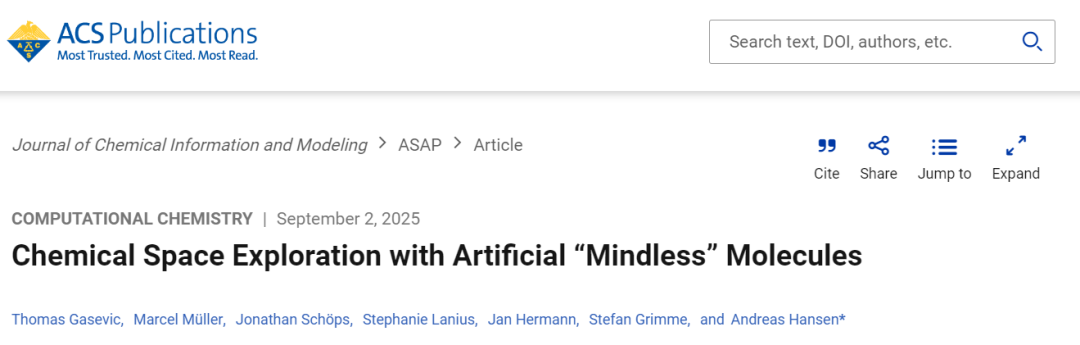 波恩大学Andreas Hansen团队以及微软研究院AI for Science研究团队于2025年9月2日在《Journal of Chemical Information and Modeling》上发表文章,题为“Chemical Space Exploration with Artificial “Mindless” Molecules”。文章提出的MindlessGen用于通过随机原子排布并随后进行几何优化来创建化学多样化的“Mindless”分子。利用这一框架,作者构建MB2061基准集,该数据集为测试、验证和训练密度泛函近似(DFA)、半经验方法、力场以及机器学习势能函数在超越传统化学空间的分子结构上的表现,提供了一个具有挑战性的基准。