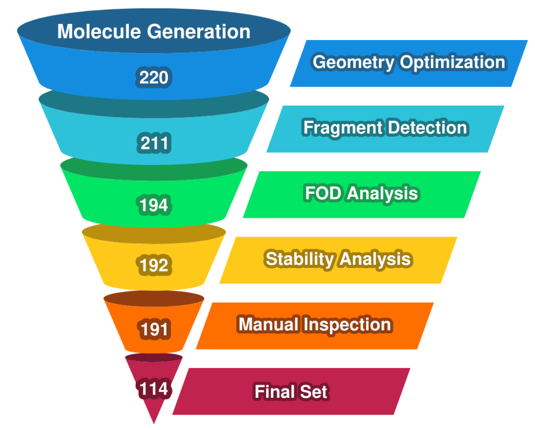 在使用MindlessGen生成用于基准测试的候选分子后,采取了一系列关键步骤,以确保得到具有代表性且可靠的结构集合。在每个体系规模(10至20个原子)下各生成20个分子,共得到220个分子,并使用半经验GFN2-xTB紧束缚方法进行优化。随后,这些结构经过所有必要检查(图3)。在DFT水平进行最终几何优化时,有9个体系未能收敛,17个结构在优化过程中发生解离。另有2个结构因FOD分析被剔除,1个因SCF稳定性分析被剔除。最终的人工检查又移除了77个结构。总体而言,约有一半的生成几何结构被舍弃。即使在这些筛选步骤之后,最终数据集仍需从元素组成和键合模式方面进行检查,以确保足够的化学多样性。这些筛选步骤中的一部分完全可以纳入全自动化流程中。