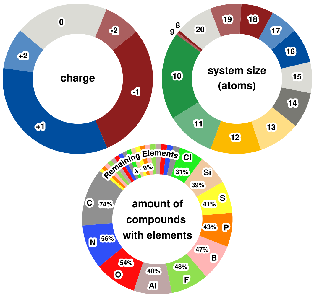 在机器学习与基准研究中,常用的量子力学(QM)数据集包括QM7、QM9、ANI-1、ANI-1x、PubChemQC、ZINC20等。其中不少数据集来源于广泛使用的化学数据库,如PubChem、ChEMBL和GDB。针对非常规分子结构的研究也已有所探索,例如“Mindless”基准集MB08-165、MB16-43、VQM24数据集以及Google DeepMind的QCML数据集。但这些数据集要么在规模上受限,要么在元素组成上有限。