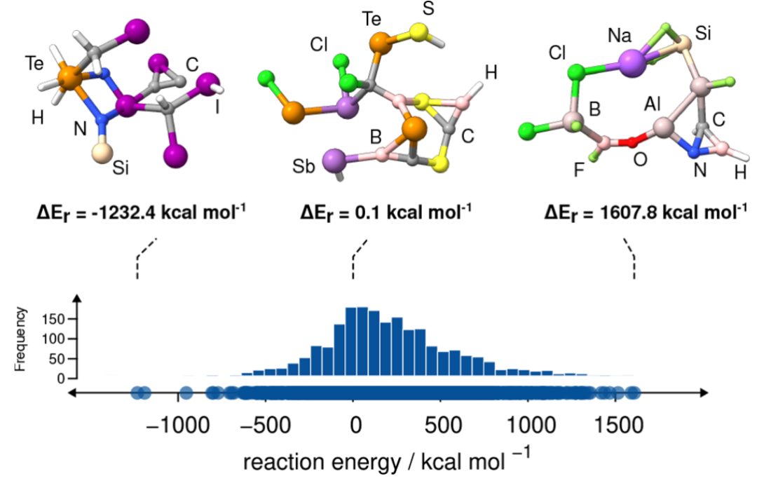 所有结构均按照前文所述工作流程进行筛选。所得分解反应能范围为−1232.4到1607.8 kcal·mol⁻¹,平均绝对值为306.3 kcal·mol⁻¹(图5)。