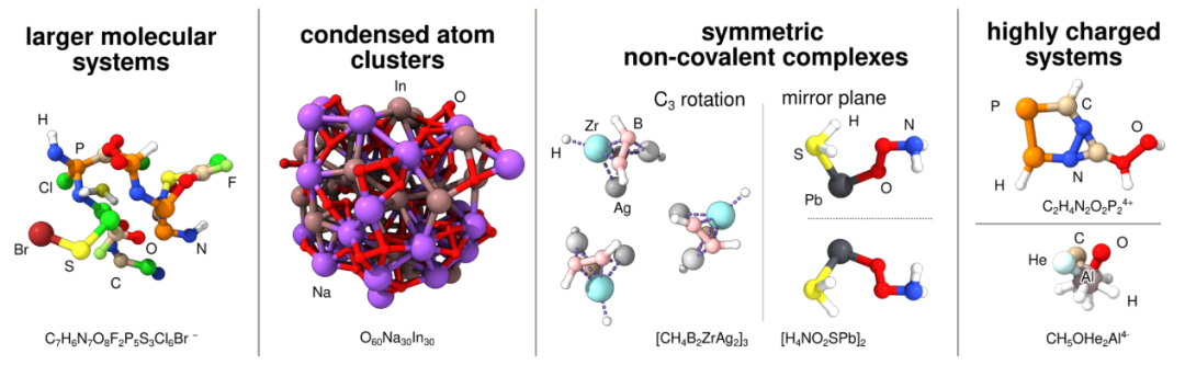图2展示了通过MindlessGen生成的典型“无直觉”分子(MLM)。除了中大型有机分子外,该生成器还支持构建大型原子簇。此外,程序还提供了生成对称副本的选项,这使得可以自动构建基于MLM的非共价相互作用(NCI)复合物。