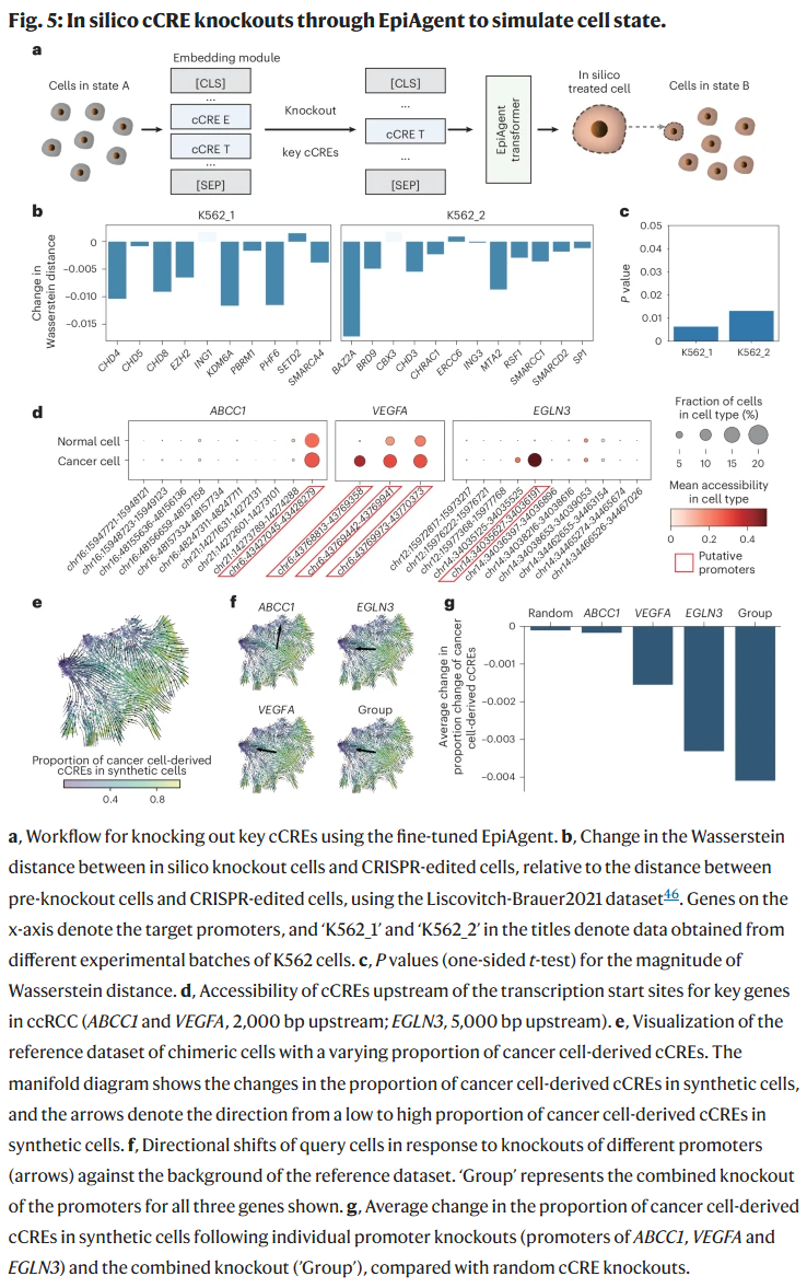 EpiAgent可在体外模拟关键cCRE的敲除,推演细胞状态变化。例如,在肾透明细胞癌(ccRCC)数据集中,EpiAgent模拟的cCRE敲除可使癌细胞向正常状态偏移,显示其在疾病机制研究中的潜力。