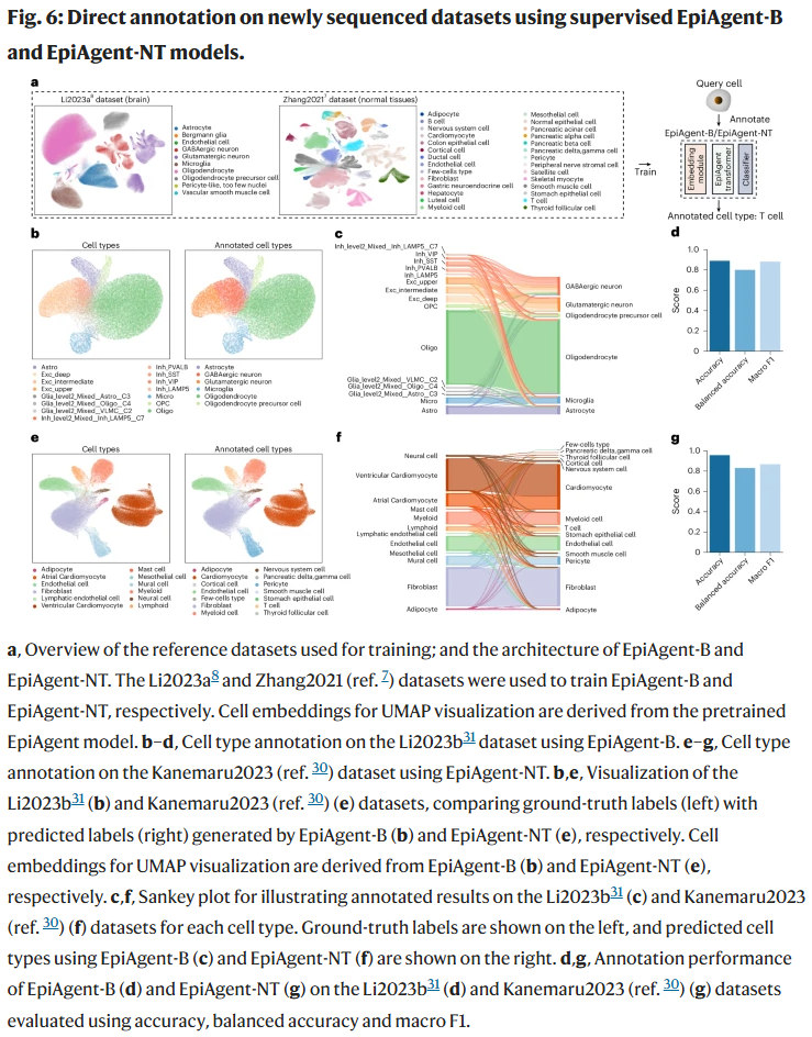 研究人员进一步构建了EpiAgent-B和EpiAgent-NT模型,专注于脑组织与非脑组织的零样本细胞类型注释。在测试集中,其准确率分别超过0.88和0.95,展示出在新测序数据中无需额外训练即可实现高精度注释的能力。