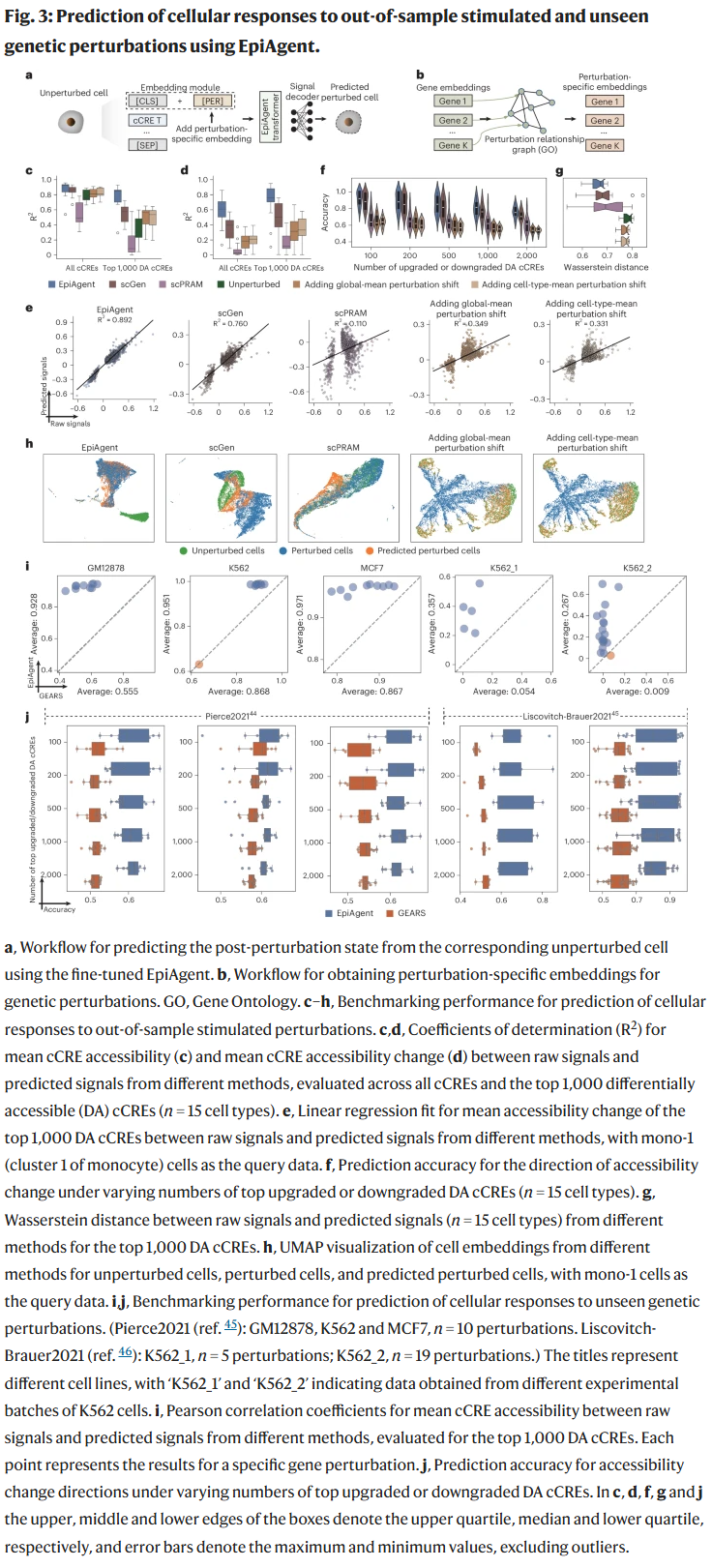 通过在输入中引入扰动特定嵌入,EpiAgent可预测外部刺激(如药物处理)和基因扰动(如CRISPR敲除)下的细胞反应。在多个数据集中,EpiAgent对差异可及性区域的变化方向预测准确率超过90%,显著优于scGen、scPRAM与GEARS。