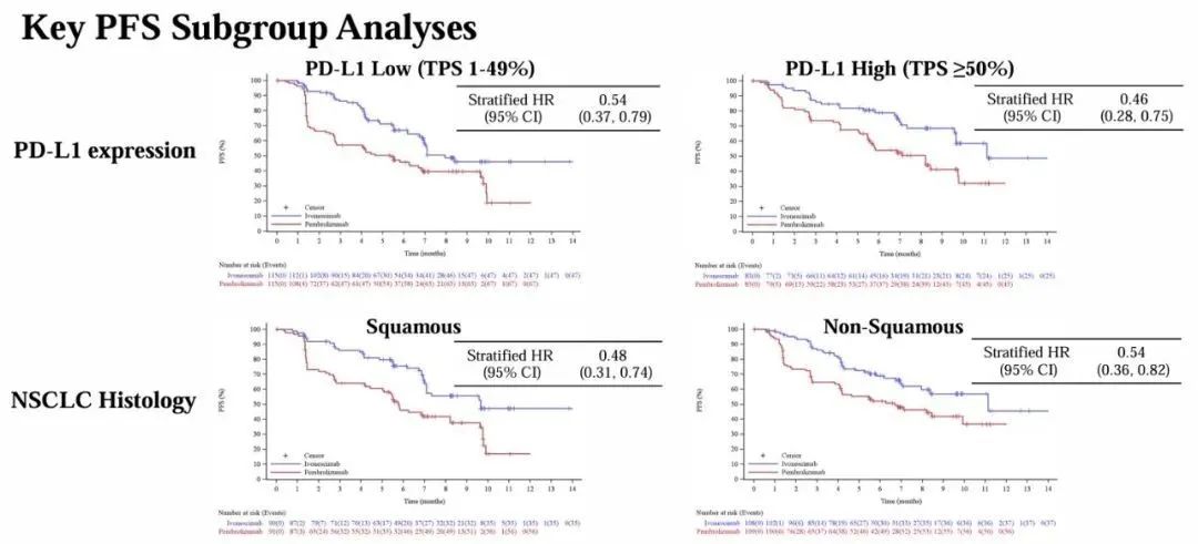 在8.67个月的中位随访期内,依沃西单抗治疗患者的中位PFS为11.14个月(95%CI: 7.33-不可估计[NE]),而帕博利珠单抗治疗患者的中位PFS为5.82个月(95%CI: 5.03-8.21)(分层HR=0.51;95%CI: 0.38-0.69;P<0.0001)。依沃西单抗和帕博利珠单抗的9个月PFS率分别为56%(95%CI: 47%-64%)和40%(95%CI: 32%-48%)。无论肿瘤PD-L1表达或组织学类型,依沃西单抗治疗组的PFS都有所改善。对于PD-L1肿瘤比例评分(TPS)介于1%~49%和≥50%的患者,分层HR分别为0.54(95%CI: 0.37-0.79)和0.46(95%CI: 0.28-0.75)。鳞癌和非鳞癌患者的HR分别为0.48(95%CI: 0.31-0.74)和0.54(95%CI: 0.36-0.82)。亚组分析显示,临床IIIB/C期患者(HR=1.01;95%CI: 0.29-3.51)是唯一未从依沃西单抗中获益的人群。