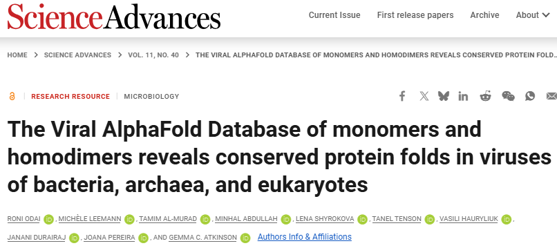 Roni Odai et al. ,The Viral AlphaFold Database of monomers and homodimers reveals conserved protein folds in viruses of bacteria, archaea, and eukaryotes.Sci. Adv.11,eadz8560(2025).