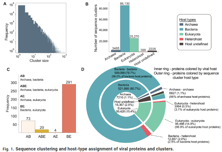 预测模型经过质量评分(pLDDT 与 pTMscore)筛选,保留高置信度结构用于聚类分析。随后,研究人员基于结构相似度(TM-align 和 Foldseek)构建病毒蛋白结构网络,并通过聚类与比对识别跨宿主的保守折叠类型。此外,还将这些折叠与已知 PDB 条目及宿主蛋白进行比对,以探索可能的结构继承与功能同源关系。