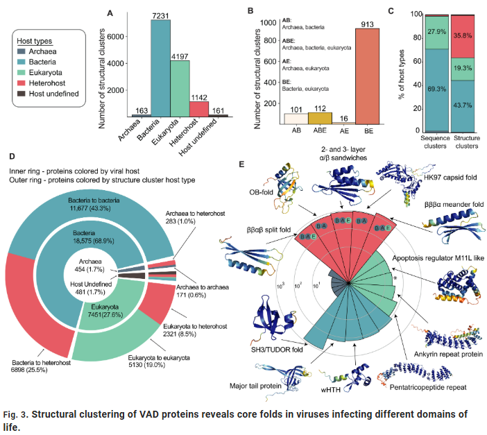 研究人员在病毒结构聚类分析中识别出超过 500 个跨宿主保守折叠簇,其中 72 个折叠同时出现在细菌、古菌与真核病毒中。这些折叠包括 ATPase 核心结构、金属离子结合域和核酸识别模块,显示出强烈的结构保守性。