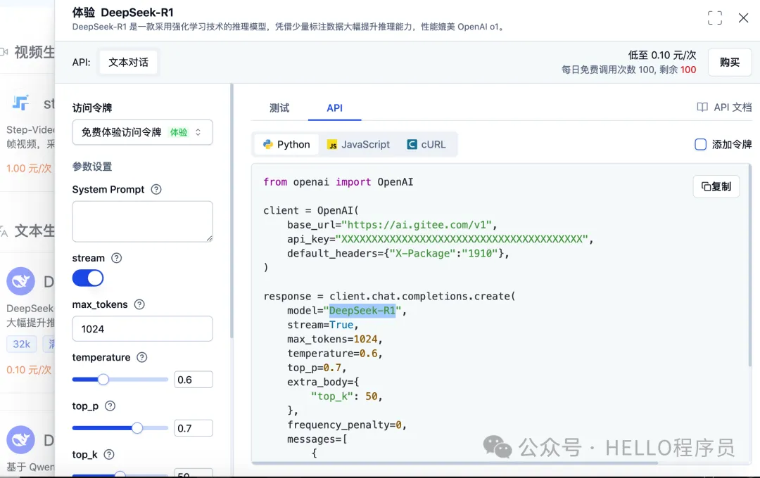 点击详情,我们看到目前GiteeAI上可以每天白嫖一百次,那来吧,咔咔一顿梭哈