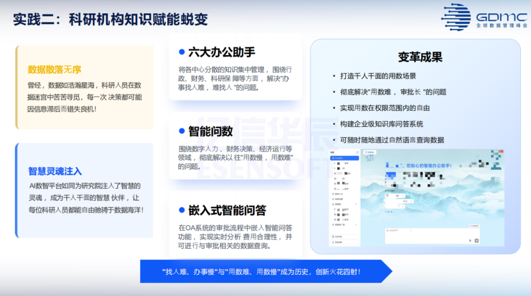 第二个例子是一个国家级重点研究机构,历史积累了大量的非结构化文本数据,通过运用大模型与RAG技术结合,构建本地私域知识库,并通过数据治理过程提升知识库的数据质量,很轻松就开发出了各种智能助手 Agent。大量应用大模型技术使得非结构化数据得充分的挖掘和应用,智能助手Agnet显著提升办公效率,加速了业务流程。