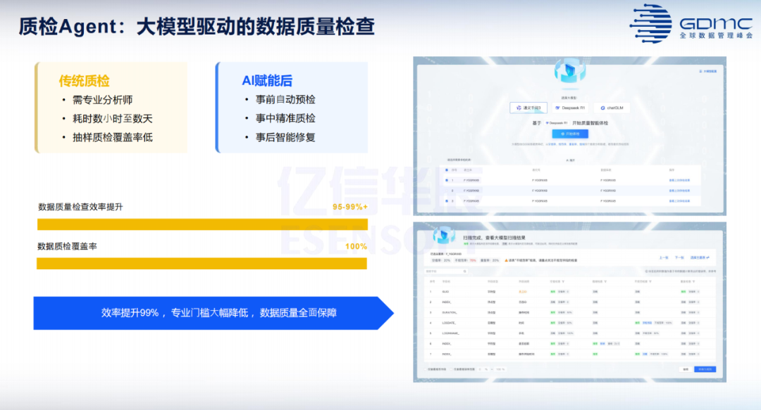 在元数据管理中,大模型的推理能力可以帮助梳理复杂系统间的数据血缘关系。在数据建模时,它可以借鉴同类项目经验,通过自然语言交互方式辅助设计。在主数据编码这一痛点上,大模型能通过文字描述找到相似编码,并辅助完成分级分类。在数据质量方面,通过学习历史问题库,大模型可以主动生成预防性的检测规则,提升数据质量和治理效率。