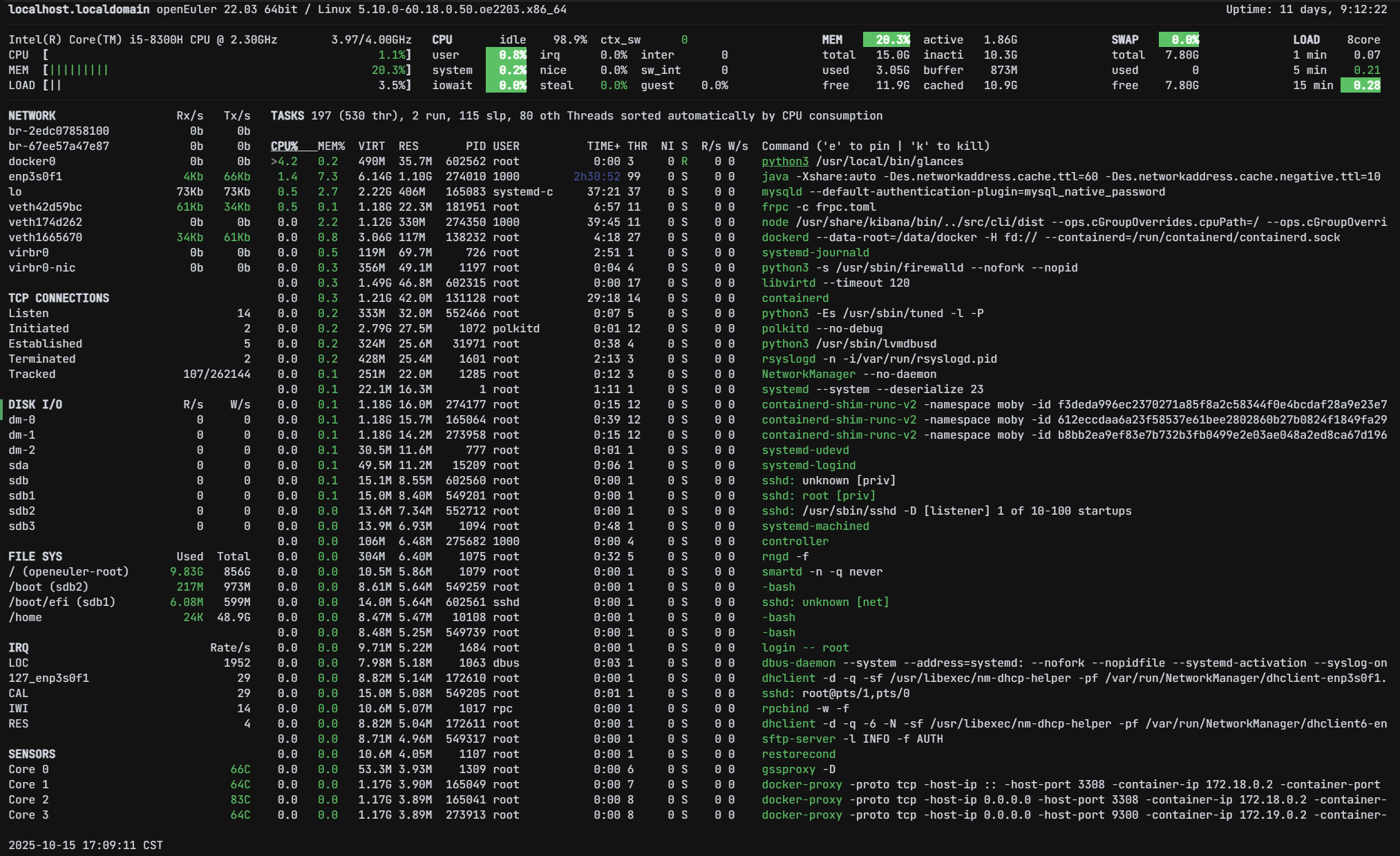 sudo dnf update -ysudo dnf install -y glancesglances --versionglances如果 openEuler 的默认仓库中没有包含 Glances 包,你也可以通过 pip 安装: