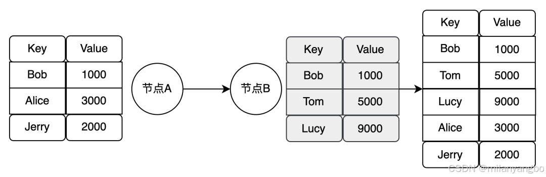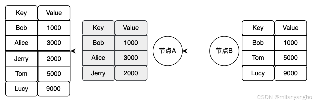 2)拉方式,节点A定期选择节点B,从B拉取其所有(或部分摘要)数据,修复A自身与B不一致的部分。
