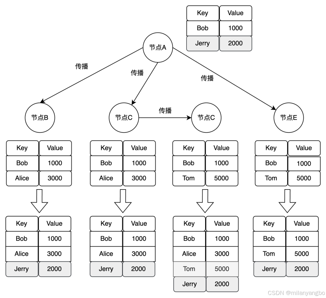 4)状态合并与更新: 节点根据接收到的信息更新本地状态。例如,如果收到的信息版本更新,则采纳新信息。