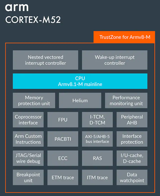2、Cortex-M52 专为需要提高数字信号处理和机器学习性能的 AIoT 应用而设计,而无需专用DSP和机器学习加速器的成本开销和节省芯片面积,通过支持Helium技术即可加速。