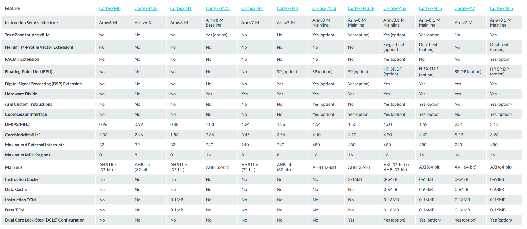 1、基于ARMv8.1-M架构的内核已经有M55和M85. 新出的M52是采用Arm Helium 技术的最小处理器,可提供出色的低功耗,为物联网提供低成本和高性能AI技术。