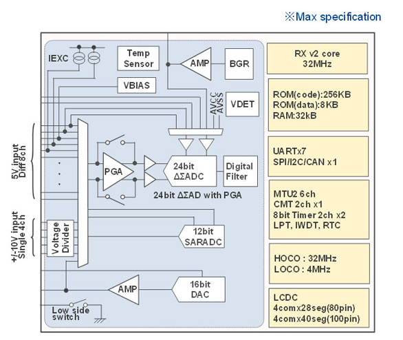 (2)瑞萨推出一款具备高速、高精度模拟前端的32位RX MCU,集成24bit ADC,转换速度125Ksps,无需外置器件可以±10V采集