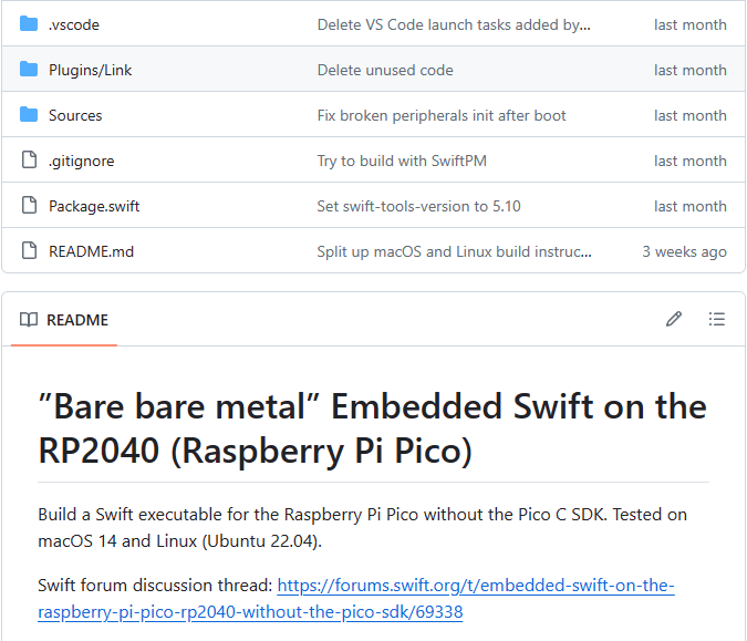 https://forums.swift.org/t/embedded-swift-on-the-raspberry-pi-pico-rp2040-without-the-pico-sdk/69338 https://github.com/ole/swift-rp-pico-bare