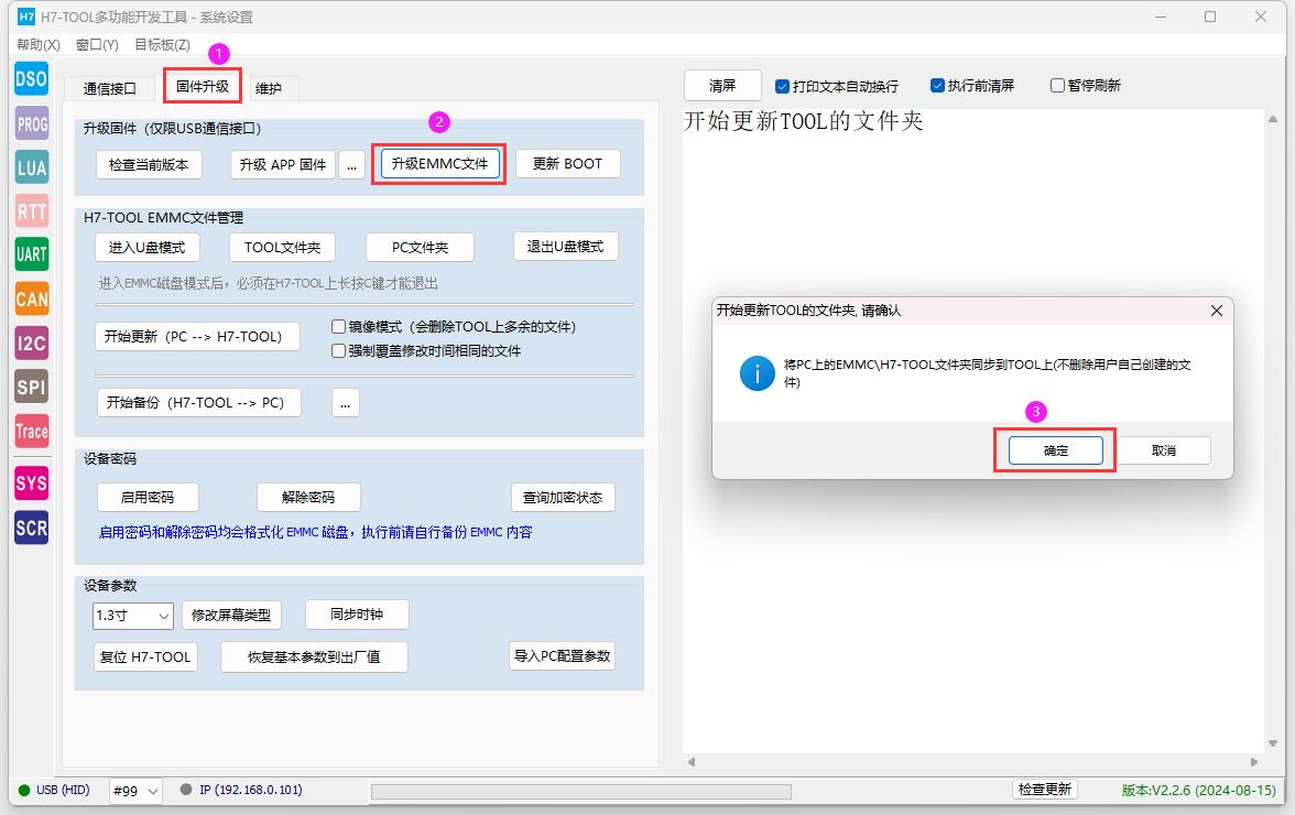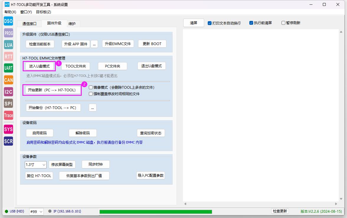 注:如果更新APP失败,从TOOL端拔掉USB线,旧版TOOL长按S键,新版TOOL长按OK键,插入USB线,3秒后松手,正常会看到电脑端有个虚拟U盘。然后拖拽上位机软件包路径h7toolPC_release\EMMC\H7-TOOL\Firmware里面的APP固件到虚拟U盘,待传输完毕后,TOOL会自动重新启动。