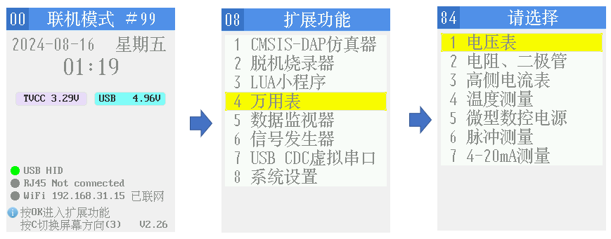 6、改操作界面,将电压表、电阻表等功能移动到万用表菜单